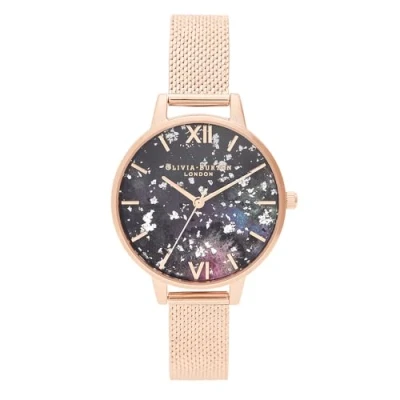 3-hand Quartz Movement Case thickness 9.2mm / Case Diameter 34mm Black and Resin and Silver Glitter dial with rose gold roman markers Stainless steel mesh bracelet with rose gold ion plating (IP) Your watch has a water-resistant rating of 1ATM or 10m (1 Bar), making it suitable for everyday use and resistant to modest water/rain splashes.