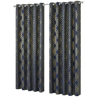 Olivia Rocco Geo Blackout Eyelet Curtains Metallic Printed Thermal Insulated Ring Top Black Out Curtain Pair Room Darkening Window Treatment For Living And Bedroom, Navy 55 x 54