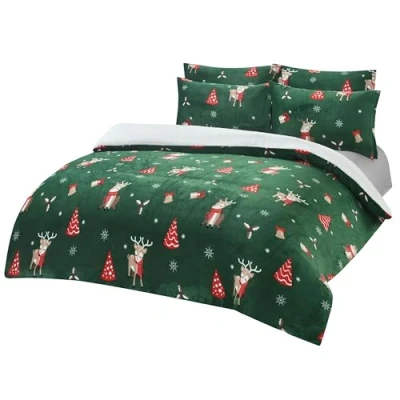 Olivia Rocco Teddy Fleece Duvet Cover Set Printed Super Soft Quilt Sets Check Stars Stag Design Warm Winter Bedding With Sherpa Reverse (Reindeer Green, Double)