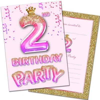 Olivia Samuel 20 Pack of 2nd Birthday Invitations with Envelopes Pink and Gold Glitter Effect Ready to Write Designed Printed in the UK