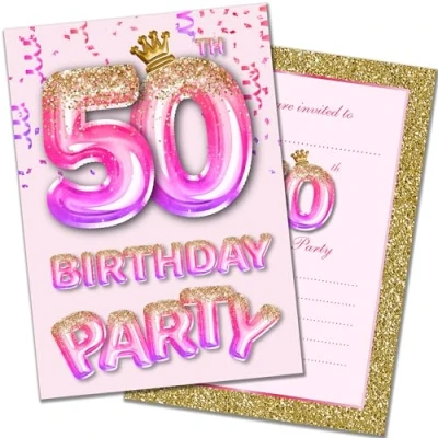 Olivia Samuel 20 Pack of 50th Birthday Invitations with Envelopes Pink and Gold Glitter Effect Ready to Write Designed Printed in the UK