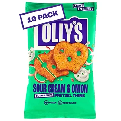 Olly's Pretzel Thins, Sour Cream, 35g (Pack of 10), Handy Snack Pouches, Healthy Plant Based Vegan Snacks for Dipping, Low Calorie Snacks, Fat, Source Fibre, No Preservatives