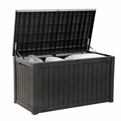 LARGE STORAGE CAPACITY: With a large 680 litre capacity, this outdoor storage box can store your garden cushions, furniture, tools, toys and more! This helps keep your garden organised, neat and tidy. Max storage weight: 25kg. External Dimensions: W141 x D70 x H75 cm, Internal Dimensions: W139 x D70 x H72 cm. Weight: 16.75kg. DURABLE AND WEATHER RESISTANT: This large storage cabinet box is made from high-quality polypropylene plastic to ensure strength and durability. It designed to be weather resistant, protecting your items from rain, snow, and harsh sunlight making it the ideal outdoor cushion storage solution. SAFE & SCURE: The storage box is lockable and comes with a 3-digit combination padlock for added security for your stored items. ThSTYLISH AND FUNCTIONAL: This outside of the storage box features an elegant wood effect that enhances the look of your garden. It features two gas-assisted lifting hinges to make opening and closing easier. Additionally, it can be used as an outdoor storage bench for seating two people on the top (max weight 150kg).is protects the contents from theft and unauthorised access. SAFE & SCURE: The storage box is lockable and comes with a 3-digit combination padlock for added security for your stored items. This protects the contents from theft and unauthorised access. EASY TO MOVE AND ASSEMBLE: This garden tool organiser is lightweight enough for two people to lift comfortably, allowing you to move it around your garden, decking or patio. It arrives flat-packed (Please Note: Will arrive in two separate cartons) with simple instructions for quick and easy assembly. Only a screwdriver is needed, and with the simple clip-together panels you will have your storage chest ready in no time!