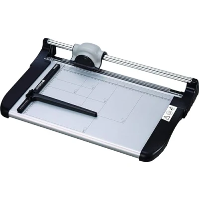 Precise cuts – the Olympia roller cutter allows precise cuts of up to 15 sheets of DIN A4 paper (80 g/m²) at once. Ideal for cutting photos, cards and documents with the highest precision. High safety – equipped with a safety cutting head with round blade, the cutting machine ensures safe handling, while the robust metal plate serves as a stable work surface. Ideal for office or home applications. Robust design – with a solid metal plate and rubberised feet, the cutter stays firmly in place and provides a non-slip base for clean and safe work. Durable and sturdy for frequent use. User-friendly – the generous worktop of 300 x 390 mm offers enough space for your cutting work. Thanks to the easy handling and precise cutting functions, the A4 paper cutter is ideal for hobbyists and professionals. Space-saving and stylish – the compact design of the cutting machine paper, with the dimensions 370 x 546 x 100 mm, fits in any office or studio. In elegant silver and black, it impresses with its style and functionality alike.