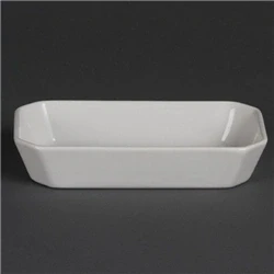 37(H) x 185(W) x 96(D)mm. Porcelain. White. Colour: White. Heat and shock resistant. Great value pure white porcelain hotelware. Meets the Vitrified Hotelware Standard BS4034. Shape: Rectangular. Oven, microwave, dishwasher and freezer proof.