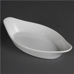 49(H) x 262(W) x 141(D)mm. Porcelain. White. Colour: White. Great value pure white porcelain hotelware. Heat and shock resistant. Meets the Vitrified Hotelware Standard BS4034. Shape: Oval. Oven, microwave, dishwasher and freezer proof.
