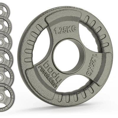 General description Introducing the Body Revolution Olympic Weight Plates, built from durable solid cast iron for high performance and long-lasting use. Perfect for both commercial and home gym setups, these weight plates are available in sizes ranging from 1.25kg to 25kg, allowing you to fine-tune your workouts and progressively increase your strength. Designed with ergonomic tri-grip handles, these plates offer superior comfort and control, making them ideal for a wide range of exercises. The three handles built into the edges provide easy handling, whether you're performing compound movements with a barbell or isolated lifts without a bar. These plates improve stability and control, enabling you to strengthen your muscles and enhance your fitness with confidence. Technical specifications Material: Solid cast iron Weight options: 1.25kg, 2.5kg, 5kg, 10kg, 15kg, 20kg, 25kg Hole diameter: 2 inches (50mm) Compatibility and accessories Compatible with Olympic barbells, dumbbells, and EZ