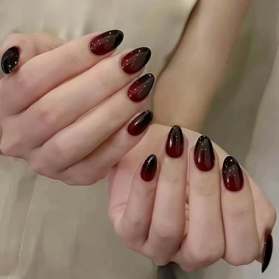 Ombre French Press on Nails Short Oval, SXVME False Round, Gradient Black Red Full Cover Fake Almond, Goth on, Acrylic Stick Nail for Wome, 24 Pcs