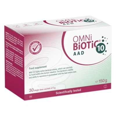 The Probiotic for Antibiotics - Use during and after any course of antibiotics! OMNi BiOTiC 10 AAD populates the intestine with 10 scientifically selected bacterial strains, which can naturally be found in the human intestine. Use: During the whole period of antibiotic therapy, stir 1 sachet of OMNi BiOTiC 10 AAD twice daily into a glass of water at room temperature, wait at least 1 minute for it to activate, stir again and then drink. Vegan, gluten free, lactose/dairy free, yeast free and conveniently packaged in single dose sachets that protect the freeze-dried bacteria from being rehydrated prematurely. Suitable for adulds, children, during pregnancy/breastfeeding and for those allergic to milk