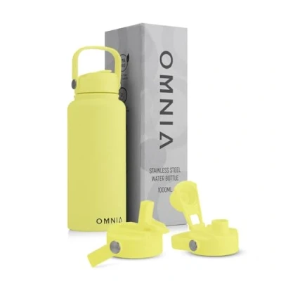 OMNIA Vacuum Insulated Stainless Steel Water Bottle, 2 Lids (Straw & Spout) Leakproof, BPA Free, Reusable Flask, Hot Cold Thermos for Sports, Gym, Travel, Outdoors (Mellow Yellow, 1000ML)
