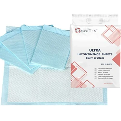 High Quality Disposable Incontinence Bed Pads with absorption capacity starting from 1400ml Soft Top Layer offers greater comfort to the user SAP embedded absorption Layer : Increases capacity and retains fluids longer 60 x 90cm: Ideal size for placement on Bed. For convenience packed in Individual Packs of 25 Omnitex Brand Guarantee: Always Top Quality - Always Lowest prices