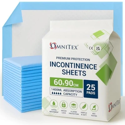 High Quality Disposable Incontinence Bed Pads with 1400ml absorption capacity. Multi layered for quick absorption and distribution of liquids. SAP embedded absorption Layer : Increases capacity and retains fluids longer. Converts liquids to gel and avoids leaks. Soft Top Layer offers greater comfort to the user. Micro channels quickly dissipates liquids and avoids accumulations and reduces moisture associated skin damage. 60 x 90cm: Ideal size for placement on Bed. For convenience packed in Individual Packs of 25 Omnitex Brand Guarantee: Always Top Quality - Always Lowest prices. ISO9001 and ISO13485 certified. UKCA and CE compliant.