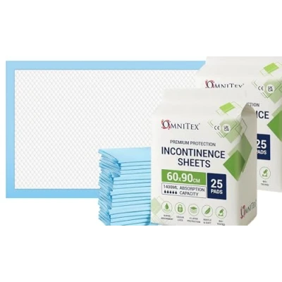 High Quality Disposable Incontinence Bed Pads with 1400ml absorption capacity. Multi layered for quick absorption and distribution of liquids. SAP embedded absorption Layer : Increases capacity and retains fluids longer. Converts liquids to gel and avoids leaks Soft Top Layer offers greater comfort to the user. Micro channels quickly dissipates liquids and avoids accumulations and reduces moisture associated skin damage. 60 x 90cm: Ideal size for placement on Bed. For convenience packed in Individual Packs of 25 Omnitex Brand Guarantee: Always Top Quality - Always Lowest prices. ISO9001 and ISO13485 certified. UKCA and CE compliant.