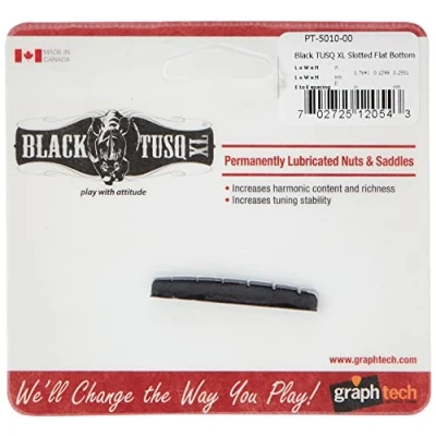 GraphTech Black TUSQ XL Guitar Nut Graphtech Black Tusq Xl Nut - Slotted Flat Bottom Designed to boost guitar performance, TUSQ XL is precision engineered and specially formulated to bring out the hidden harmonics and richness in every note. TUSQ XL is based on the highly resonant TUSQ man made ivory and impregnated with PTFE, the slipperiest substance on earth, to improve the tuning performance of the guitar. Improved tuning stability, improved harmonic content