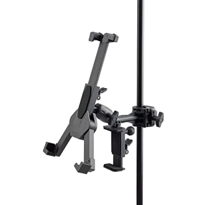 Constructed of durable, lightweight plastic, the On-Stage TCM1500 delivers ergonomic, in-performance access to your tablet or cell phone along with a world of attachment and orientation options. The tablet and cell holders, each of which boast protective padding at all contact points, adjust from 8" to 12" in height to 3.5" in width and 2.5"H x 4"W respectively. Meanwhile, the assembly adapter provides 180 degrees of tilt with a full 360 degree rotation and accepts any standard 5/8"-27 threaded mic stand, or, with the included clamp, attaches directly to any .75" to 1" stand or desktop. Holds tablets and devices from 7.9" to 12.9". Adjusting from 8" to 12" High and 3 1/2" to 9 1/2" Wide the TCM1500 accomodates vast array of tablet sizes from 7.9" to 12.9", including iPad Pro and Microsoft Surface Lightweight, less than 1 lb, yet made of strong, durable plastic with soft protective padding at contact points Assembly adapter allows holder 180 degree tilt and 360 degree rotation Includes a battery/cell phone holder that adjusts from 2 1/2" to 4"