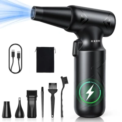 Super Power Airflow & Deep Cleaning:This compressed air delivers powerful speeds of up to 150,000 RPM,offer a maximum wind speed of 46 m/s for efficient dust and debris removal. With 3 adjustable wind speeds,it easily handles a wide range of cleaning tasks. Durable Battery & Fast Charging:Our air duster built-in high-quality battery for long-lasting performance.Fully charges in 3 hours and powers air duster for up to 120 minutes of runtime on the lowest gear.Plus,it support 4 charging options, even when you’re on the go.With overheating protection,our air duster ensure lifespan and consistent performance long-term. Reusable&Energy-Saving:Compared with traditional compressed air cans, our compressed air cleaner for pc can be reused, energy-saving and upgrading your cleaning experience.No liquid will be produced during cleaning and will not damage your electronic devices.Our compressed air cans are an alternative to air cans, one-time investment that lasts long time. LED Light & Portable Design:Weighing only 0.61lb(277g),our cordless air blower features lightweight and portable. Its LED light and storage bag make it perfect for indoor cleaning, outdoor adventures, travel and camping.Plus,LED light design allows you to clean more easily in the dark. Multi-Purpose & Easy to Use:Comes with 5 nozzles and 3 brushes,ONEWAY electronics compressed air dusters greatly meet your different cleaning tasks.With the right nozzle or brush, it easily cleans PC,keyboards, cameras, cases, blinds, and car interiors.Also perfect for home, car, and outdoor use, such as inflating air mattresses, clearing leaves or snow, starting campfires, and drying pet hair.