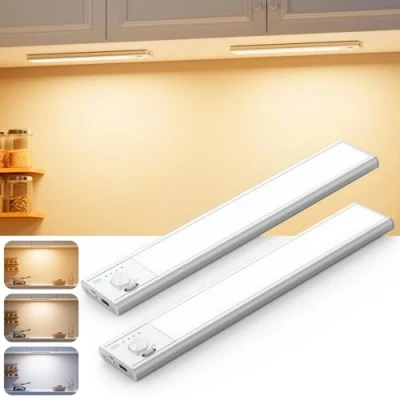 【High-Efficiency Sidelight Tech】Our LED under cabinet kitchen lights feature 76 LED beads with refractor tech, delivering glare-free illumination perfect for under cupboard kitchen lights or pantry cabinet storage areas. 【Smart Motion Detection】Built-in motion sensor lights indoor activates within 3m/120° , Auto-off after 20s to conserve energy. Ideal safety solution for dim kitchen under cabinet light zones or hallway under shelf lighting. 【Professional Light Control】3 Color temperature selection (2700K-6000K) + 10-100% dimmable LED strip adapts from task under counter lights to ambient wardrobe lights motion sensor mode. 【Space-Saving Install】Ultra-slim 1.4cm profile with magnetic mount fits tightest kitchen cabinet gaps. Includes adhesive pads for non-metal surfaces, Easily convert any cupboard lights area. 【Multi-Scene Use】Beyond kitchen under cabinet lighting, perfect for: Wardrobe lights with auto-detection; RV under cupboard lights setups; Garage sensor light indoors needs. 1000mAh USB-C rechargeable battery operated LED strip lights last 6-50hrs, 45 days in motion sensor light mode. Battery indicator ensures seamless kitchen lights under cabinet LED experiences. Also ideal as gifts, such as Mother's Day, Christmas, birthday gifts 【24-Hour Customer Service】To enhance your user experience, we offer 24-hour customer service to answer your questions if you encounter any problems during use. Package Includes: 2x Under Cabinet Kitchen Lights, 2x charging cables, 2x iron sheets with adhesive tape for installation, and 1x user manual.