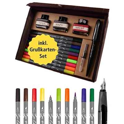 SET – The Master Set all-in-one for calligraphy, hand lettering, bullet journaling, brush lettering and creative writing and designing. The wooden box made from bamboo offers lots of space for all implements! FOUNTAIN PEN – The soft triangle shaped fountain pen with an iridium calligraphy nib size 1,4 mm is refillable with converter (included) or standard and combi ink cartridges. CALLI.BRUSH – The innovative brush pen with DOUBLE TIP: a thin, angled calligraphy nib (2 mm) for precise lining and a flexible brush nib for creative writing and lettering. 10 intense colours. INK - Three different ink bottles à 15ml with the colours black, brown and red & one converter. The high-quality ink will inspire creative writing and makes it really fun to create more by hand again! GREETING SET - Every card and tag can be designed by hand which makes it a unique item. The jute twine is perfect to fix the gift tag to the present. (6x greeting cards A6, 6x gift tags, 2m jute twine). Paper size: a6