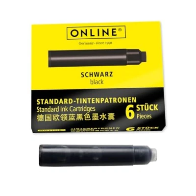 FOR STANDARD FOUNTAIN PENS: Refill cartridges for everyone who likes to write with fountain pens or rollerballs, compatible with all common standard fountain pens and rollerball systems BOX OF INK CARTRIDGES: 6x standard cartridges. Refill cartridges for home, school or the office. Cartridge length 3.8 cm QUALITY: ONLINE ink is of high quality and convinces with a constant colour tone and a smooth writing experience. Made in Austria PREMIUM INK: Intense shades available in various bright colours ONLINE brand quality: ONLINE has been a German company since 1991 and specializes in writing implements, calligraphy sets, cases and much more