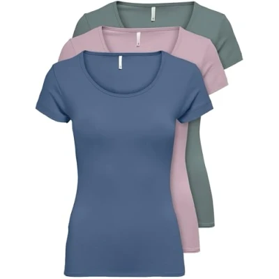 Only 15209153 Women's Short Sleeve T Shirt Long Basic Summer Shirts XS S M L XL Pack of 3, Colour Mix