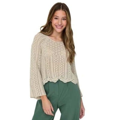 Comfort – Plain sweater in chunky knit Pointelle structure design. Fashionable clothing to feel good. Combine the short-cut top in a variety of ways with all your outfits Fit - Cropped regular fit cut. The crew neck, cuffs and 3/4 sleeves ensure a loose and comfortable cut. Model is wearing size S. The length for size S is 44 cm. Material: the soft fabric made from 70% recycled cotton, 30% polyester offers high-quality workmanship and pleasantly light stretch comfort with every movement. Basic – timeless and minimalist basic design, a classic in the fashion world. The versatile all-rounder Onlnola - 15233173, for your daily looks Onlnola Life 3/4 Sweater KNT Noos