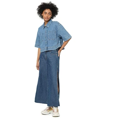 ONLY Women's Onlcleo Life Ss Crop DNM Shirt PIM Noos, Medium Blue (Medium Denim), L