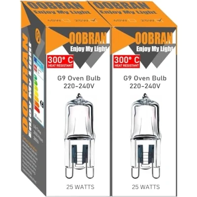 The g9 oven bulbs are constructed using premium glass materials, and they illuminate instantly without any delay. The oven bulbs have a standard G9 base, making them simple to fit into G9 light fixtures and sockets. The oven bulbs are capable of withstanding temperatures up to 300 degrees Celsius. Due to the full glass construction, the oven light bulbs are able to emit light in a 360-degree radial pattern. The G9 oven bulbs are suitable for use in ovens, microwaves, and other light fixtures with a G9 base., Manufacturer: OOBRAN