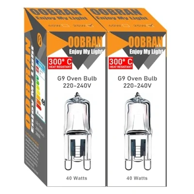 The g9 oven bulbs are constructed using premium glass materials, and they illuminate instantly without any delay. The oven bulbs have a standard G9 base, making them simple to fit into G9 light fixtures and sockets. The oven bulbs are capable of withstanding temperatures up to 300 degrees Celsius. Due to the full glass construction, the oven light bulbs are able to emit light in a 360-degree radial pattern. The G9 oven bulbs are suitable for use in ovens, microwaves, and other light fixtures with a G9 base., Manufacturer: OOBRAN
