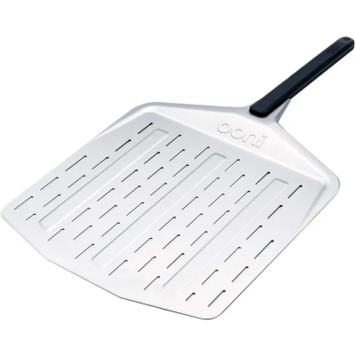 ESSENTIAL PIZZA OVEN ACCESSORY: Our Perforated Peel Features many of the same advantages as our classic peel, but the addition of the slits and ridges, means that any excess flour will fall through, which will prevent it from burning in your oven. PIZZA PREP – The high quality, aluminium perforated pizza paddle is the professional’s tool of choice - Giving all pizza lovers the perfect surface to stretch out dough, add their favourite toppings and launch it in their Ooni Pizza oven! Just remember to sprinkle your Ooni pizza peel with flour beforehand to help your perfect pizza to slide with ease. READY, SET & LAUNCH – With the added benefit of perforations that allow excess flour to fall away and steam to quickly evaporate. Helping you create your own great pizza every time! When you retrieve your pizza from the oven after cooking, steam will pass through the slits, which will help your pizzas be crispier and tastier! PROFESSIONAL GRADE – The Perforated Peel is an excellent tool for the pizzaiolo that's ready to go beyond the basic peel and have a more specialised tool. Made from lightweight aluminium the Ooni Perforated Pizza Peel can manoeuvre pizzas with ease – Helping you prep, slide, turn or retrieve your delicious pizza like a pro! HOT HOT HOT – Because Ooni pizza ovens can reach temperatures of 500°C the long and strong handle keeps you away from the heat whether just cooking your lunch or hosting your very own pizza party – made from glass reinforced nylon, means the handle is more resistant to heat than most other materials in the market, making the Ooni Perforated Peel one of the must have pizza oven accessories.