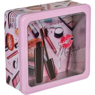 Metal tin box for storage. Square box with a window in the colour pink. Box for toiletry items or make up.
