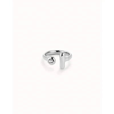 Open 18K gold-plated ring with white topaz on one end and bar on the other. Made in Spain with a 100% handmade process.A collection in which topaz, clean lines and geometric shapes become protagonists, without filters.A collection ready to wear at any time or situation. Discover the collection ser indomable.