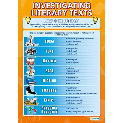 EDUCATIONAL CHART DESIGNED BY TEACHERS: Our Investigating Literary Texts poster helps students to learn, engage and remember more information than ever before. Covering the basic ways to analyse a literary text, this unique school poster can play a vital role in improving both students' understanding and classroom décor. SUPPLEMENT KNOWLEDGE: Our educational school posters are colourful, beautifully illustrated and contain a huge amount of valuable information. This English Literature poster is specifically designed to help students gain a greater overview of how to analyse literary texts. The wall chart is a great resource for Schools, Classrooms, English Teachers, Students, Tutors, Home School Parents and Home School Kids. MAKE LEARNING FUN: Engaging, clear and colourful designs and images create a fun learning environment in which students can excel. Our amazing wall posters can help to increase students’ interest towards English Literature, while recapping any key information they've been taught. LARGE SIZE – IDEAL FOR READING FROM A DISTANCE: Our school wall charts are a generous size, measuring 850mm x 594mm (A1). This ensures all posters are easily readable from a distance. Our educational posters are a fantastic way of brightening and decorating any classroom and can easily complement every type of learning environment. THE UK’s NO. 1 PROVIDER: Brought to you by Daydream Education, the UK's leading provider of educational posters for schools, with a range that spans over 25 subjects across key stages 1 – 5. By combining a bold, visual approach with simple, concise information, we have provided over five million resources to more than 50,000 classrooms worldwide.