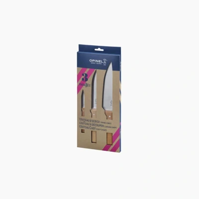 Opinel set of 3 knives Includes No 126 Paring Knife / No 118 Chefs Knife / No 120 Carving knife half tang X50CrMoV15 stainless steel with riveted handle Varnished Beech handle