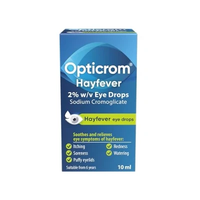 TARGETED RELIEF: Soothes itchy, red, watery eyes associated with hayfever FAST RELIEF WITHIN 2 MIN: Starts working within just 2 minutes to help you get on with your day. EFFECTIVE FORMULA: Solution contains 2% sodium cromoglicate for effective relief of eye allergy symptoms EASY APPLICATION: Teardrop-shaped bottle and tapered nozzle make it easy to use Opticrom drops FOR ADULTS & CHILDREN: Opticrom is intended for use by adults and children aged 6 years or older