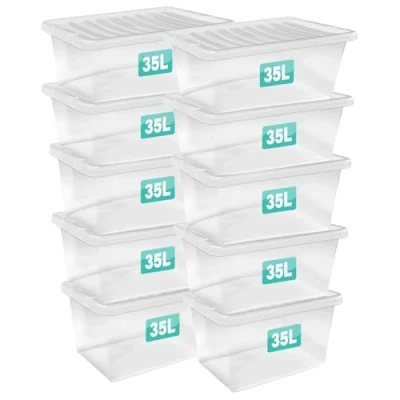 Optimal Products 10 x 35 Litre Clear Plastic Storage Box With Lids UK BRITISH MADE Home Office Stackable Transparent Boxes, Size 5,11,24,28,35,45,62