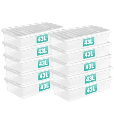 Optimal Products 10 x 43 L Underbed Clear Plastic Storage Box With Lids UK BRITISH MADE Home Office Stackable Transparent Boxes, Sizes 5,11,24,28,35,45,62 Litre