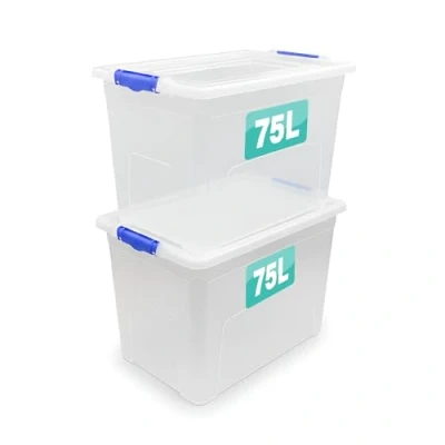 CLEAR STORAGE BOXES WITH CLIPPING LIDS: Optimal Products set of 2 plastic storage boxes with lid are strong, sturdy & made in Britain from premium quality polypropylene plastic. They are 100% BPA free food safe with no nasty smell. The clear plastic storage box with lid provide easier visibility while the clip-lock handles provide secure tight seal VERSATILE LONG LASTING STORAGE: These plastic boxes with lids storage provide all round multipurpose storage solution to declutter your life. The clear plastic storage boxes are perfect storage containers to declutter home, office or workplace These big plastic storage boxes come in a set of 2, offering ample room for a variety of items ranging from duvets, pillows, food, toys, shoes, accessories, garden tools etc. SPACE SAVING, STACKABLE & NESTABLE: Save valuable floor space with these stacking storage boxes. They are incredibly strong and won't break when stacked. When not in use, you can easily nest the large storage boxes together to save space. PEACE OF MIND: At Optimal Products, we take pride in our customer support, exceeding expectations. As a British brand, we are committed to the highest quality standards, ensuring utmost customer satisfaction. Check out our brand's shopfront for a full range of storage solutions from small to large plastic boxes for storage to bankers box & underbed storage boxes with lids to declutter your space. SPACE SAVING STACKABLE STRUCTURE: Designed to stack securely when full and nest inside one another when empty, these stackable containers are perfect for saving floor space in tight areas like lofts, wardrobes, or cupboards. Ideal as plastic home storage boxes or storage boxes clothes organizer units. SECURE CLIP LOCK LID & ERGONOMIC HANDLES: Each large container with lid is fitted with two robust clip locks that keep the lid tightly in place, ensuring your items stay protected during transport or long-term storage. Use as moving boxes, xl storage boxes with lids, or cheap plastic storage boxes for budget-friendly organization. LARGE CAPACITY: Each 75L large storage box measures approximately 58 x 40 x 39cm, 75 litre capacity and weighs just 2.20Kg.