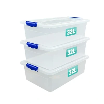 CLEAR STORAGE BOXES WITH CLIPPING LIDS: Optimal Products set of 3 plastic storage boxes with lid are strong, sturdy & made in Britain from premium quality polypropylene plastic. They are 100% BPA free food safe with no nasty smell. The clear plastic storage box with lid provide easier visibility while the clip-lock handles provide secure tight seal VERSATILE LONG LASTING STORAGE: These plastic boxes with lids storage provide all round multipurpose storage solution to declutter your life. The clear plastic storage boxes are perfect storage containers to declutter home, office or workplace These big plastic storage boxes come in a set of 3, offering ample room for a variety of items ranging from duvets, pillows, food, toys, shoes, accessories, garden tools etc. SPACE SAVING, STACKABLE & NESTABLE: Save valuable floor space with these stacking storage boxes. They are incredibly strong and won't break when stacked. When not in use, you can easily nest the large storage boxes together to save space. PEACE OF MIND: At Optimal Products, we take pride in our customer support, exceeding expectations. As a British brand, we are committed to the highest quality standards, ensuring utmost customer satisfaction. Check out our brand's shopfront for a full range of storage solutions from small to large plastic boxes for storage to bankers box & underbed storage boxes with lids to declutter your space. SPACE SAVING STACKABLE STRUCTURE: Designed to stack securely when full and nest inside one another when empty, these stackable containers are perfect for saving floor space in tight areas like lofts, wardrobes, or cupboards. Ideal as plastic home storage boxes or storage boxes clothes organizer units. SECURE CLIP LOCK LID & ERGONOMIC HANDLES: Each large container with lid is fitted with two robust clip locks that keep the lid tightly in place, ensuring your items stay protected during transport or long-term storage. Use as moving boxes, xl storage boxes with lids, or cheap plastic storage boxes for budget-friendly organization. LARGE CAPACITY: Each 32L Underbed storage box measures approximately 58 x 40 x 18cm, 32 litre capacity and weighs just 1.25Kg.