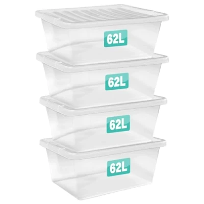 VERSATILE ORGANISATION: Ideal for any room, these storage boxes for under bed storage, or home & kitchen organisation, offer a practical way to store a variety of items, from toys to linens, ensuring your space remains tidy and organised with minimal effort. STRONG, DURABLE & BPA-FREE PLASTIC: Optimal Products Collection plastic storage boxes are proudly manufactured in Britain with premium quality polypropylene clear plastic. 100% BPA free and food safe, with no nasty smell. These clear storage boxes with lids & integrated handles provide ease of use, easier visibility & navigation MULTI-PURPOSE STORAGE FOR HOME & OFFICE: These plastic boxes with lids storage provide all round multipurpose storage solution to declutter your life. These clear plastic storage boxes are suitable for multi-purporse plastic storage containers to declutter home, office or workplace. MAXIMIZE YOUR SPACE: Our clear plastic storage box with lid (Clear) are perfect for decluttering your home, providing an efficient solution for organizing seasonal clothing, shoes, and more while keeping everything visible and accessible. HIGH GRADE & DURABLE: Our premium quality under bed storage box with lid is manufactured in Britain with polypropylene material with no nasty smells. These multipurpose sleek plastic boxes with lids storage are perfect for under bed storage. SMART DESIGN & IDEAL SIZE: The under bed box features a sleek profile that fits perfectly under most beds, allowing you to utilize otherwise wasted space while keeping your belongings safe and out of sight. Dimensions Approx: Comes as a set of 4, Each plastic box measures L65 x 49W x H28 cm, 62 litre capacity and weighs just 1.0Kg