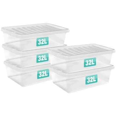 Optimal Products 5 x 32 Litre Underbed Clear Plastic Storage Box With Lids UK BRITISH MADE Home Office Stackable Transparent Boxes, Size 5,11,24,28,35,45,62