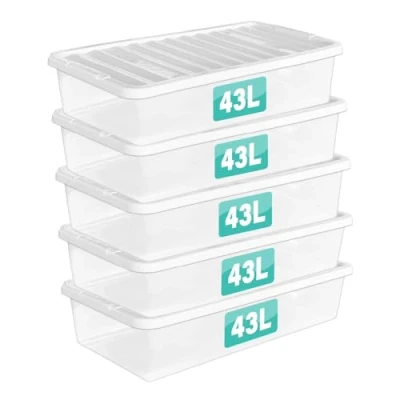Optimal Products 5 x 43 Litre Underbed Clear Plastic Storage Box With Lids UK BRITISH MADE Home Office Stackable Transparent Boxes, Size 5,11,24,28,35,45,62