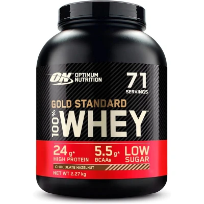 Optimum Nutrition Gold Standard 100% Whey 2.27kg Chocolate Hazelnut is a premium protein powder offering 24g of high-quality whey protein and 5.5g BCAAs per serving, supporting muscle growth and recovery with rich flavor, low sugar, and global recognition as the #1 bestselling whey protein.