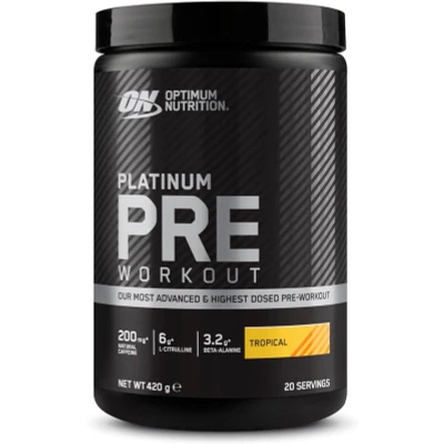 Optimum Nutrition Platinum Pre-Workout 420g Tropical is an advanced pre-workout supplement, delivering 200mg natural caffeine with 8x more L-Citrulline and 2x more Beta-Alanine, plus B vitamins, PerformMelon, L-theanine, and grape extract to support energy, focus, and performance for high-intensity training.