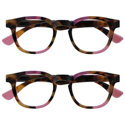 Two pairs of women's / ladies designer style distance glasses. Sturdy frame design with spring hinges. Easy to clean. Scratch-resistant. Super comfort fit. Includes FREE designer style pouch. In hand finished brown tortoiseshell with a touch of pink. Strength -2.00.