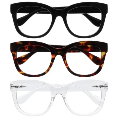 OPULIZE BIG Blue Light Blocking Glasses Bold Oversized Round Fashion Frame Anti Glare Reflective Computer Gaming 3 Pack UV & Eyestrain Protection Black Brown Clear Mens Womens