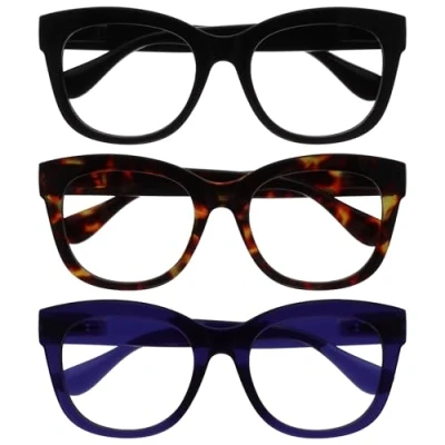 OPULIZE BIG Blue Light Blocking Reading Glasses Bold Round Fashion Frame Anti Glare Reflective Computer Gaming 3 Pack UV & Eyestrain Protection Black Brown Indigo Mens Womens +3.50