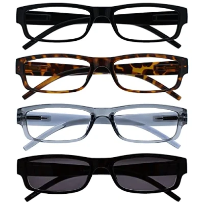 Lightweight & comfortable mens/womens/unisex 'Designer' style reading glasses with reading sunglasses 4 pack. Reading glasses in black, brown tortoiseshell and grey finishes. For indoors / normal reading conditions. One pair of reading sunglasses in black finish for reading in the sun (UV400 protection, blocks UVA and UVB rays). Sturdy frame design. Excellent value.