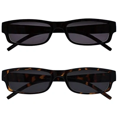 Two pairs of lightweight & comfortable mens/womens/unisex 'Designer' style reading sunglasses. One pair in black finish and one pair in brown tortoiseshell finish. Glasses for reading in the sun. UV400 protection, blocks UVA and UVB rays. Sturdy frame design. Excellent value.