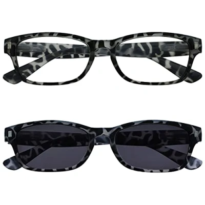Stylish mens/womens/unisex reading glasses / reading sunglasses twin pack. Reading glasses for indoors / normal reading conditions with a matching pair of reading sunglasses for reading in the sun (UV400 protection, blocks UVA and UVB rays). Sturdy frame design with spring hinges. Black milky tortoiseshell finish.