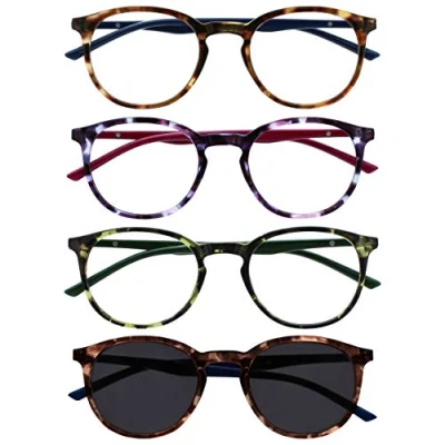 Super stylish large size men's / women's / unisex reading glasses with reading sunglasses 4 pack. Reading glasses in brown Tortoiseshelll front with navy blue arms, purple Tortoiseshelll front with cherry red arms and green Tortoiseshelll front with moss green arms. One pair of reading sunglasses in brown Tortoiseshelll front with navy blue arms for reading in the sun (UV400 protection, blocks UVA and UVB rays). Sturdy round frame design with spring hinges. Easy to clean. Scratch-resistant. Comfort fit. Includes FREE designer style pouch. Strength +3.00.